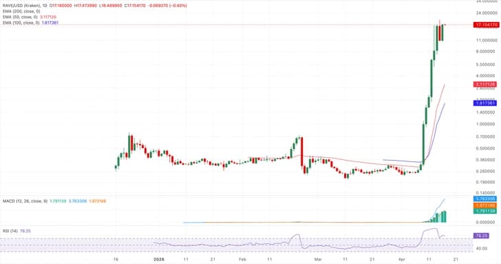 RAVE торгуется выше $17 на момент публикации в пятницу, продолжая резкий бычий тренд значительно выше своих базовых трендовых показателей. Пара уверенно держится выше как 50-дневной экспоненциальной скользящей средней (EMA) на уровне $3,1171, так и 100-дневной EMA на уровне $1,8174, что подчеркивает сильную поддержку восходящего тренда, несмотря на вертикальный характер последнего роста.