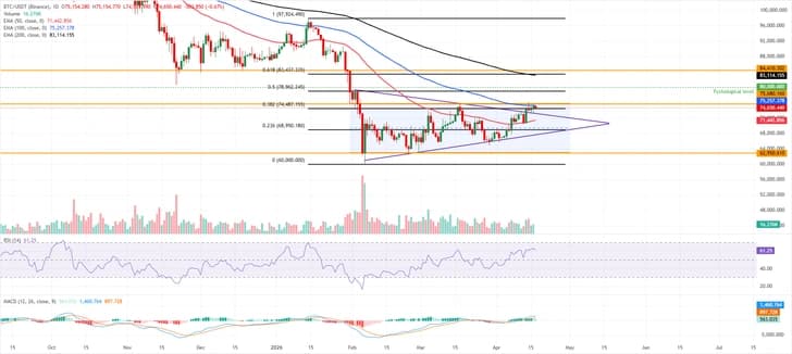 Биткоин торгуется немного ниже около $74 650 в пятницу, столкнувшись с отскоком около 100-дневной экспоненциальной скользящей средней (EMA) на уровне $75 257. Ранее на этой неделе BTC повторно протестировал и нашел поддержку около ранее пробитой верхней границы фигуры Восходящий треугольник (построенной с помощью соединения максимумов и минимумов двумя линиями тренда с начала февраля) около $73 400, что намекает на классический сценарий прорыва и ретеста.