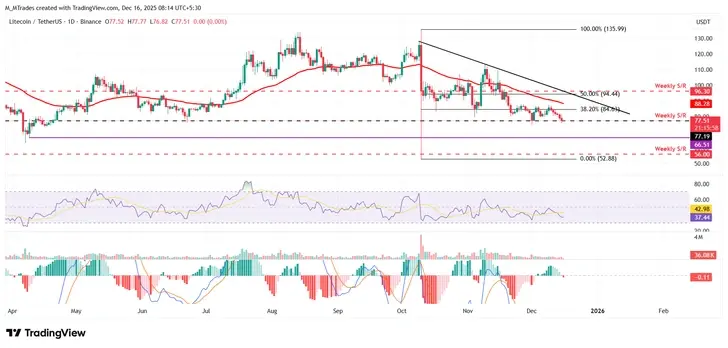 Litecoin (LTC) остается под сильным давлением продаж, торгуясь ниже $78 во вторник, увеличив свою серию потерь до семи подряд дней после отклонения на ключевой зоне сопротивления. С учетом снижения социального интереса и ухудшения индикаторов импульса, понижательные риски остаются доминирующими.