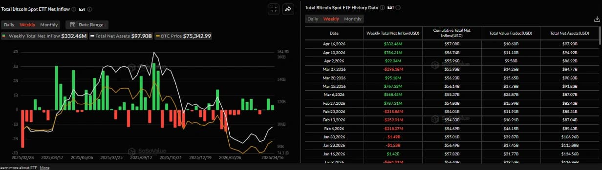 Биткоин (BTC) продолжает рост выше $75 000 на момент написания в пятницу, при этом быки, по-видимому, намерены преодолеть недельный максимум около $76 000. Альткоины, включая Эфириум (ETH) и Ripple (XRP), демонстрируют позитивный прогноз, при этом ETH находится выше $2 350, а XRP близок к своему недельному максимуму $1,46.