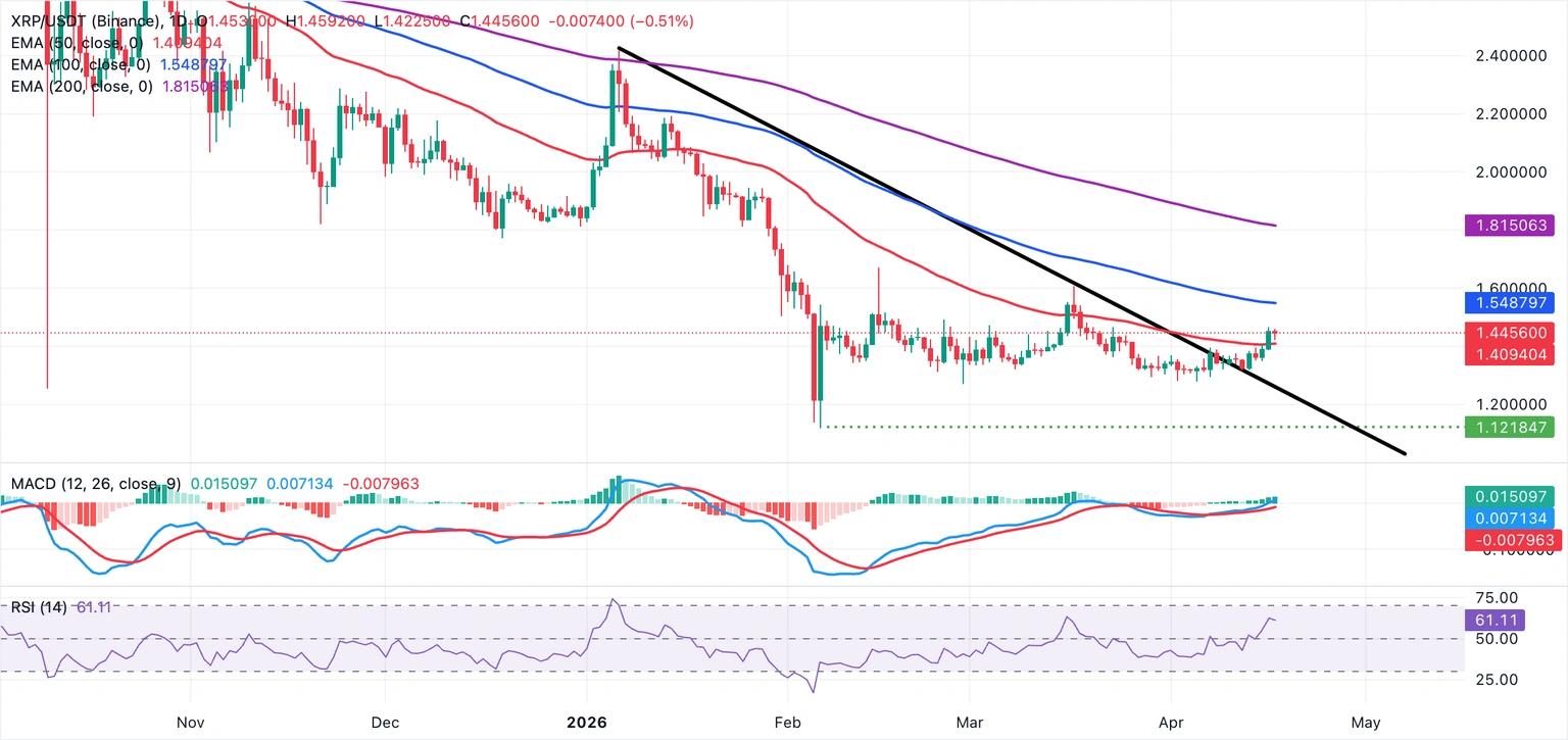 Ripple (XRP) торгуется на уровне $1,44 на момент написания в пятницу, при этом его рост, по-видимому, ограничен недельным максимумом около $1,47. Тем не менее, общий настрой остается бычьим, поскольку токен для переводов удерживается выше ключевых уровней поддержки на $1,40 и $1,30.