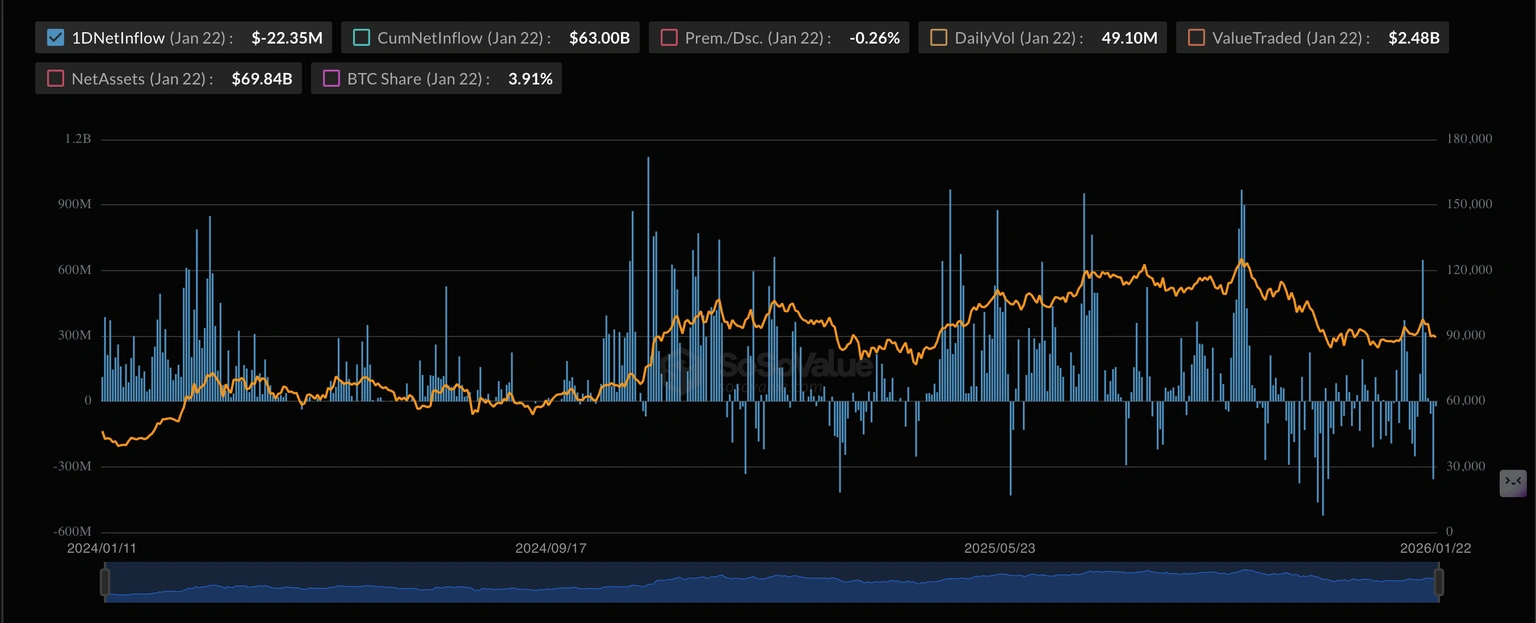 Биткоин (BTC) торгуется ниже $90 000 на момент написания в пятницу, снизившись почти на 5% за эту неделю. Несмотря на кратковременное улучшение аппетита к риску после речи президента США Дональда Трампа в середине недели на Давосе, которая завершила введение новых тарифов на европейские страны в ответ на их противодействие покупке Гренландии США, Крипто Король остается под давлением, так как институциональный спрос продолжает ослабевать на этой неделе.