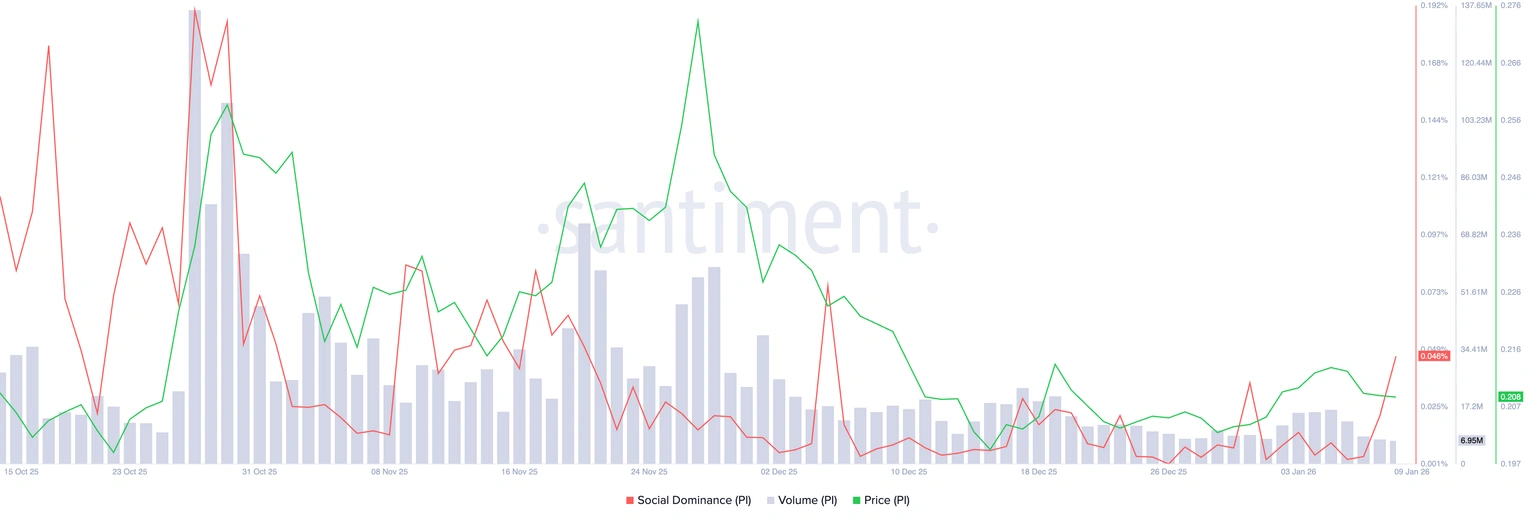 Pi Network (PI) торгуется близко к $0,2100 на момент публикации в пятницу, стабилизируясь после двухдневного снижения почти на 2%. Объем торгов токена PI стабильно снижается, в то время как рост социальной доминирующей позиции предполагает потенциальный скачок розничного интереса. Технический прогноз для PI остается смешанным, так как полосы Боллинджера сжимаются, что предполагает прорыв в любую сторону.