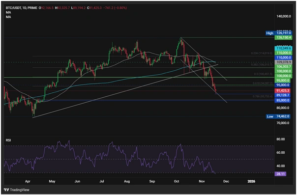 Биткоин продолжает падение, снизившись на 25% от рекордного максимума в 126,2k в начале октября, опустившись до минимума в 89,1k сегодня, уровня, который в последний раз наблюдался в апреле. Крупнейшая криптовалюта упала в семи из последних восьми сессий, что оставило ее в красной зоне на 2025.