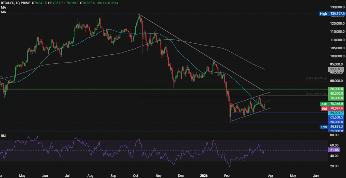 Биткоин растет во вторник, продолжая рост предыдущей сессии, поскольку надежды на деэскалацию конфликта в Иране кратковременно повысили спрос на рисковые активы. Однако отскок выглядит хрупким, поскольку макрориски по-прежнему доминируют в общем фоне рынка.