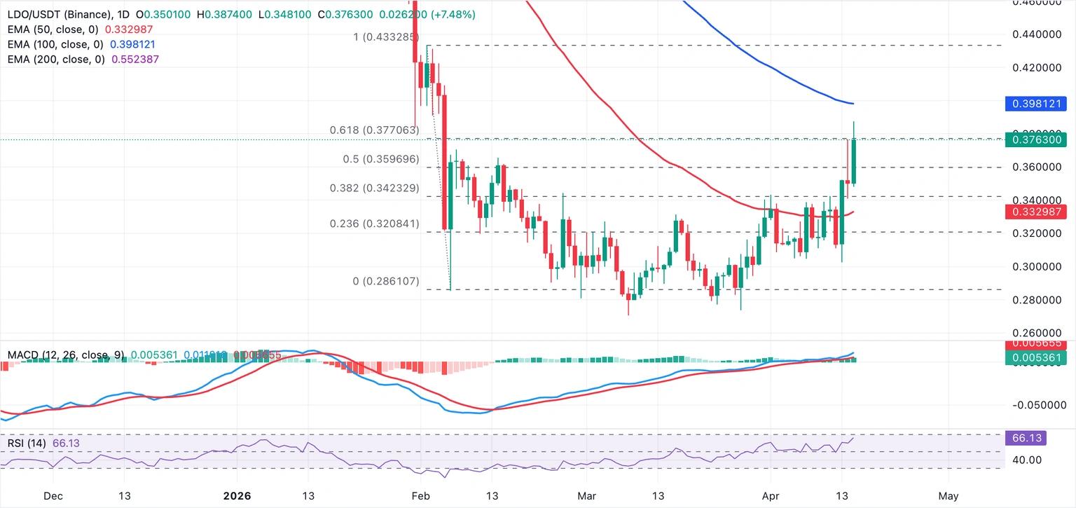 Lido DAO (LDO) поднимается выше $0,37 на момент написания статьи в среду, на фоне общего восстановления криптовалютных цен. Токен ликвидного стейкинга (LST) вырос более чем на 8% внутри дня, поддерживаемый сильными индикаторами моментума. Отвоевание зоны офферов около $0,40 может увеличить шансы на устойчивое восстановление.