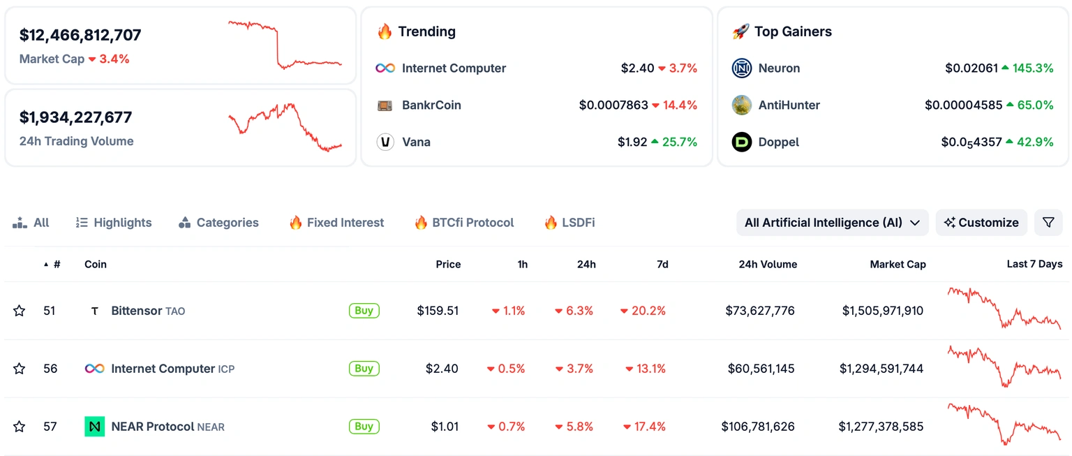 Криптовалюты на основе искусственного интеллекта (AI), включая Bittensor (TAO), Internet Computer (ICP) и Near Protocol (NEAR), торгуются под сильным давлением, так как настроение бегства от риска охватывает крипторынок. Общая капитализация сегмента снизилась на 3,4% за последние 24 часа до $12,5 миллиарда, подрывая потенциальные возможности для покупки на падении.