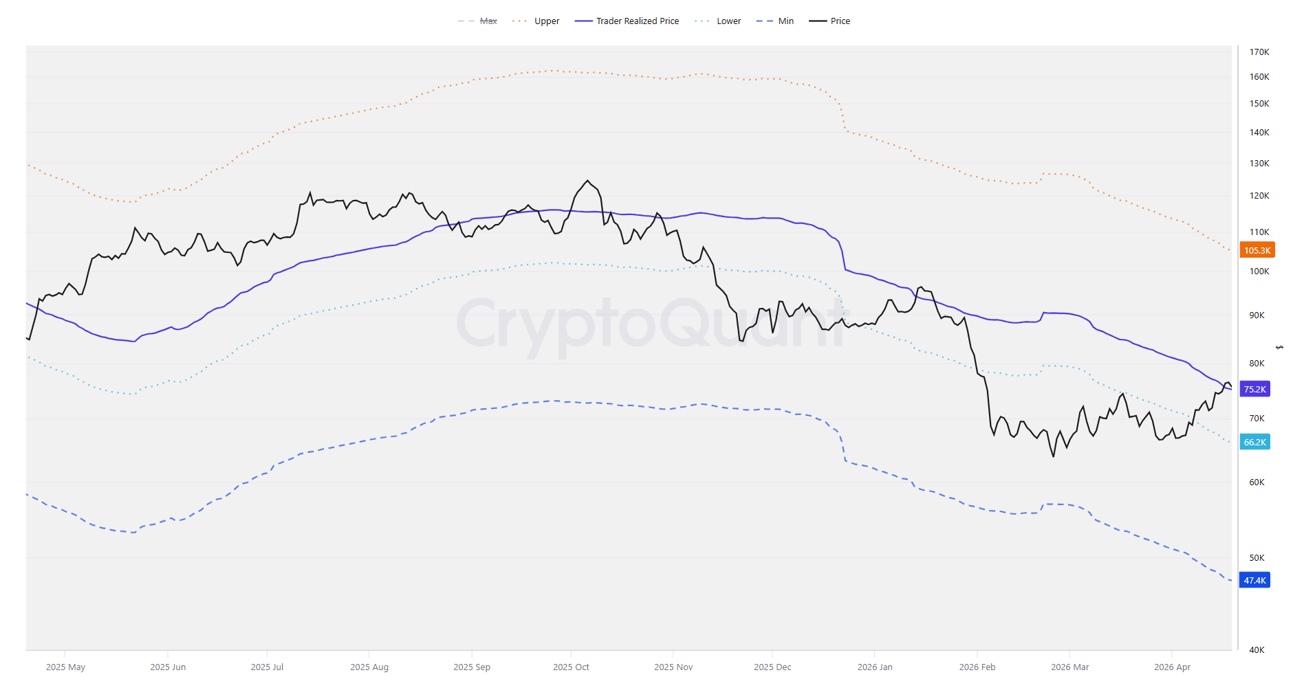 Как объяснялось в предыдущем еженедельном прогнозе по биткоину, BTC закрылся выше цены реализованных трейдером сделок (Trader Realized Price) — около $75 200, которая исторически ограничивала ралли восстановления. Если цена BTC удержится выше этого уровня, ралли может продолжиться в ближайшие дни.