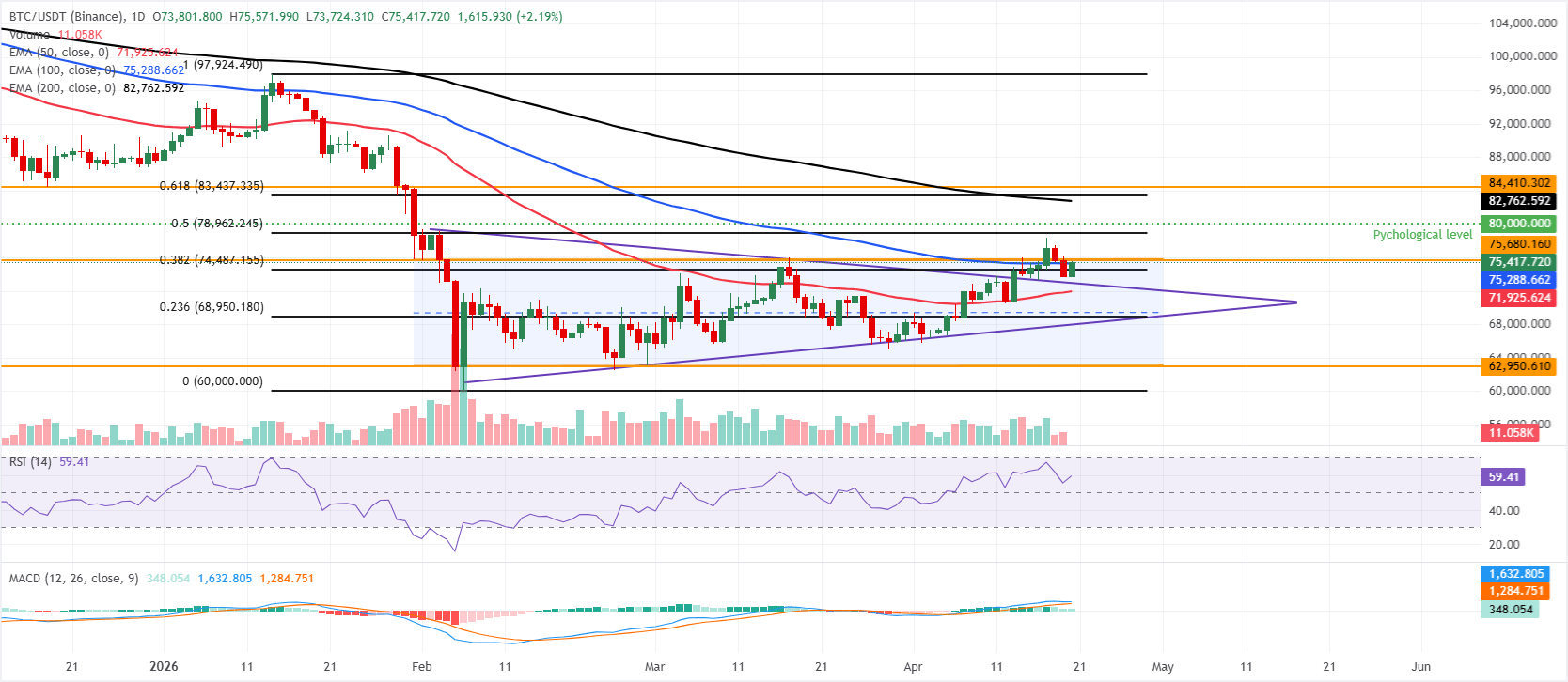 Сверху устойчивое закрытие выше 100-дневной EMA около $75 288 и ближайшего горизонтального сопротивления на $75 680 откроет путь к уровню коррекции 50% на $78 962 и психологической отметке $80 000.