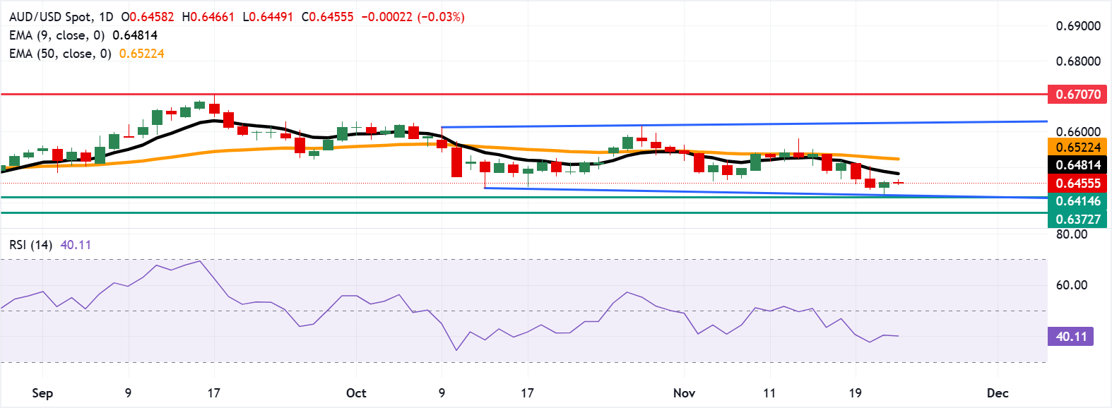 Пара AUD/USD торгуется около 0,6450 в понедельник. Дневной график показывает, что пара движется в боковике в пределах прямоугольного диапазона, отражая фазу консолидации цен. Тем временем цена продолжает оставаться ниже девятидневной экспоненциальной скользящей средней (EMA), что указывает на подавленный краткосрочный импульс.