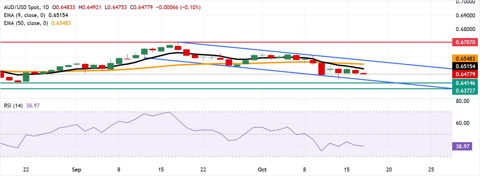 AUD/USD торгуется около 0,6480 в пятницу. Технический анализ на дневном графике указывает на продолжающийся медвежий настрой, так как пара движется в рамках нисходящего канала. Кроме того, 14-дневный индекс относительной силы (RSI) остается ниже уровня 50, что усиливает медвежий настрой.