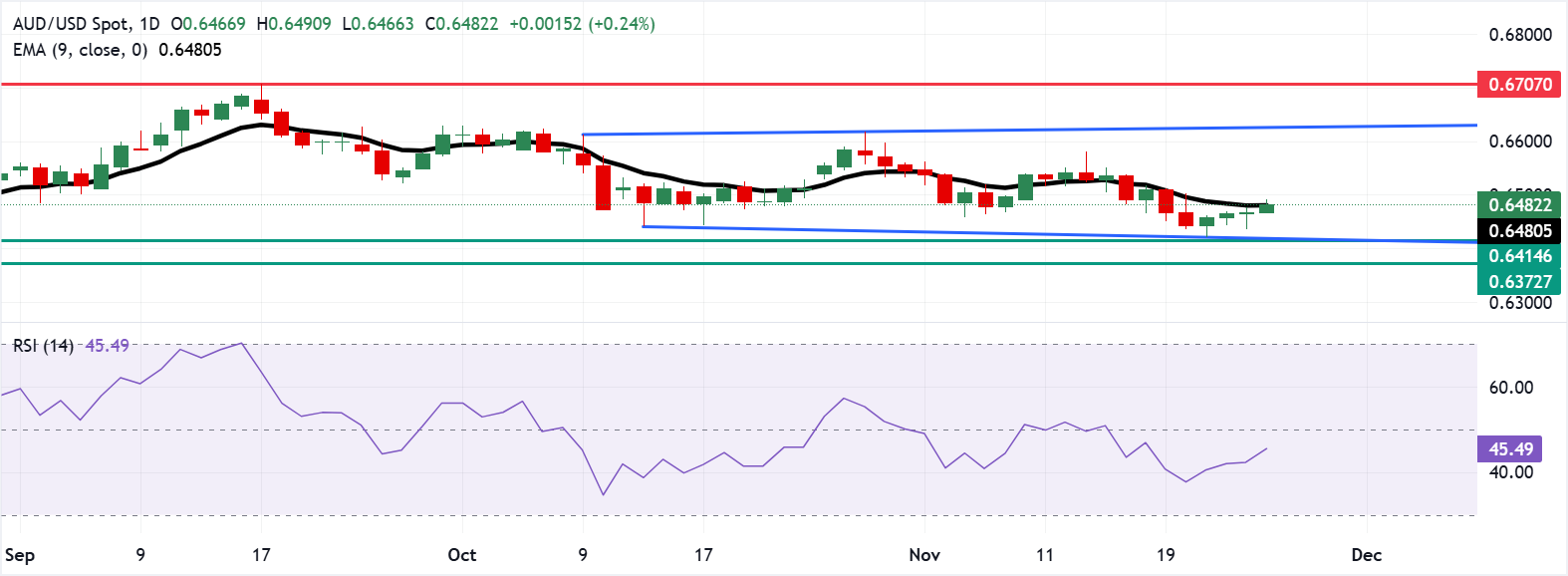 Пара AUD/USD торгуется около 0,6480 в среду. Анализ дневного графика показывает, что пара удерживается в прямоугольной зоне консолидации, сигнализируя о нейтральном уклоне. Пара продолжает торговаться ниже девятидневной экспоненциальной скользящей средней (EMA), что подчеркивает подавленный краткосрочный импульс.