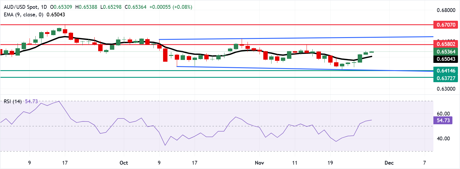 Пара AUD/USD торгуется около 0,6540 в пятницу. Технический анализ дневного графика показывает, что пара торгуется в пределах прямоугольной зоны консолидации, отражая нейтральный уклон. Пара поднялась выше девятидневной экспоненциальной скользящей средней (EMA), что указывает на укрепление краткосрочного бычьего импульса.