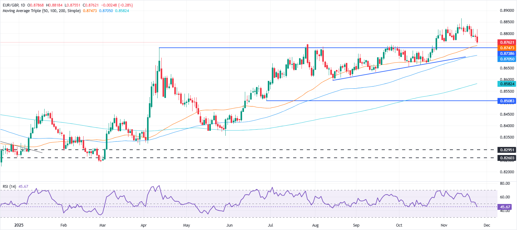 Пара EUR/GBP отступает в среду после того, как последний бюджет Великобритании, представленный канцлером Рэйчел Ривз, кажется, был хорошо воспринят инвесторами, что изначально привело к распродаже британского фунта, который сократил свои предыдущие потери. На момент написания кросс торгуется на уровне 0,8766, снизившись на 0,24%.