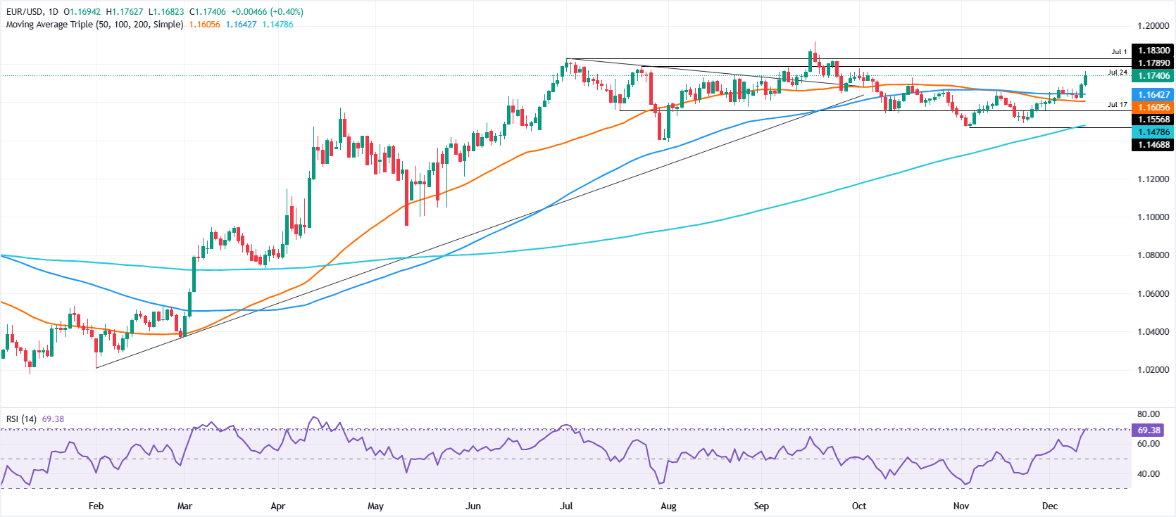 Технический анализ: EUR/USD преодолевает 1,1700, нацеливаясь на 1,1750