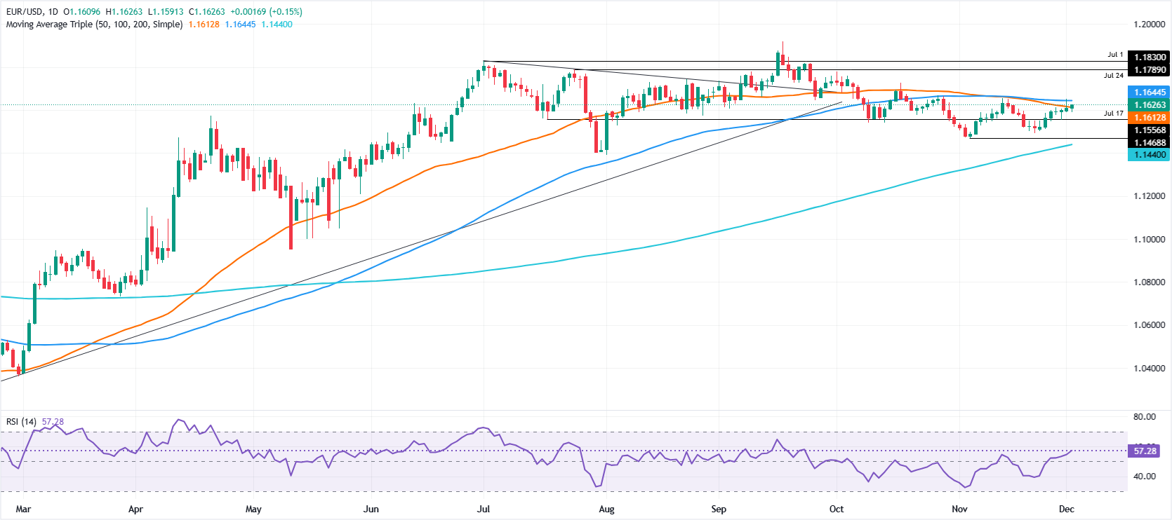 Пара EUR/USD регистрирует скромный рост на 0,12% в конце вторника во время североамериканской сессии, так как аппетит к риску улучшается. Ожидания еще одного снижения ставки ФРС в декабре и высокая инфляция в еврозоне поддерживают единую валюту. Пара EUR/USD торгуется на уровне 1,1625 после отскока от дневных минимумов на уровне 1,1591.