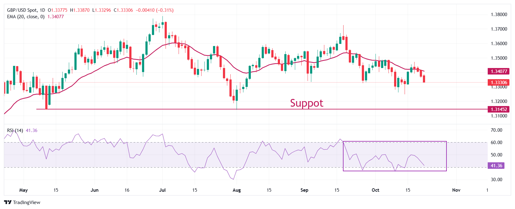 Фунт стерлингов продолжает падение до уровня около 1,3330 против доллара США в среду. Пара GBP/USD снижается после того, как не смогла превысить уровень, отмеченный 20-дневной экспоненциальной скользящей средней (EMA), которая находится около 1,3407.