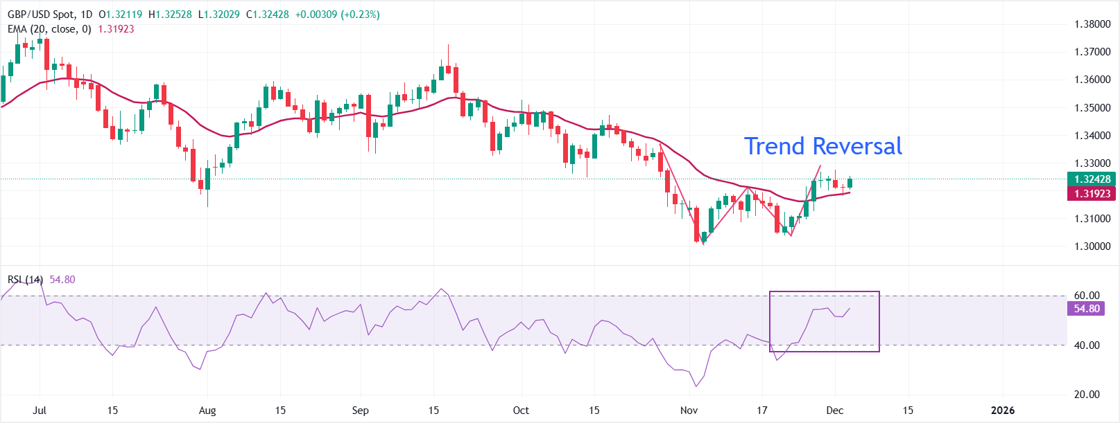 Фунт стерлингов поднимается до уровня 1,3250 против доллара США в среду. Пара GBP/USD удерживается выше 20-дневной экспоненциальной скользящей средней (EMA) на уровне 1,3192, демонстрируя положительный тренд в краткосрочной перспективе.