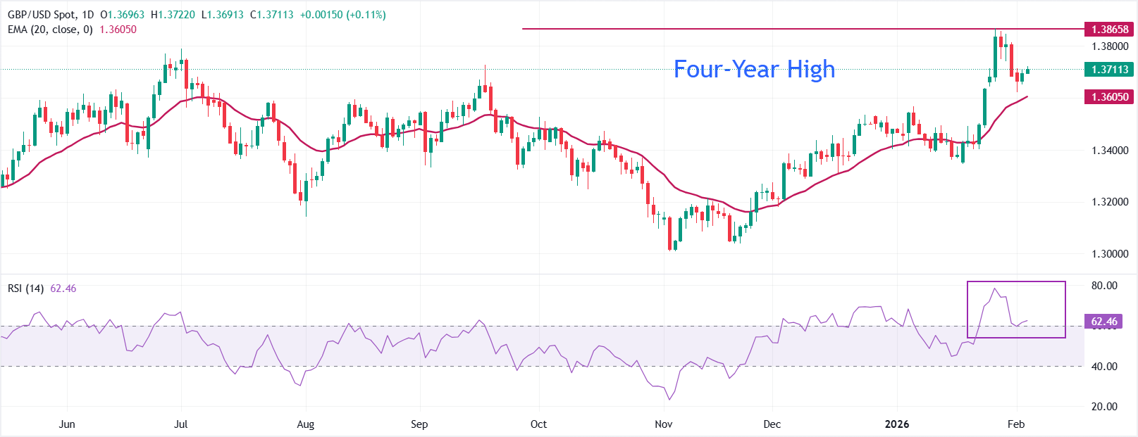 GBP/USD торгуется с повышением на уровне около 1,3712 на момент написания. Пара удерживается выше восходящей 20-дневной экспоненциальной скользящей средней (EMA) на уровне 1,3605, что сохраняет краткосрочный тренд направленным вверх. 20-дневная EMA укрепилась за последние сессии, сигнализируя о нарастающем восходящем давлении.