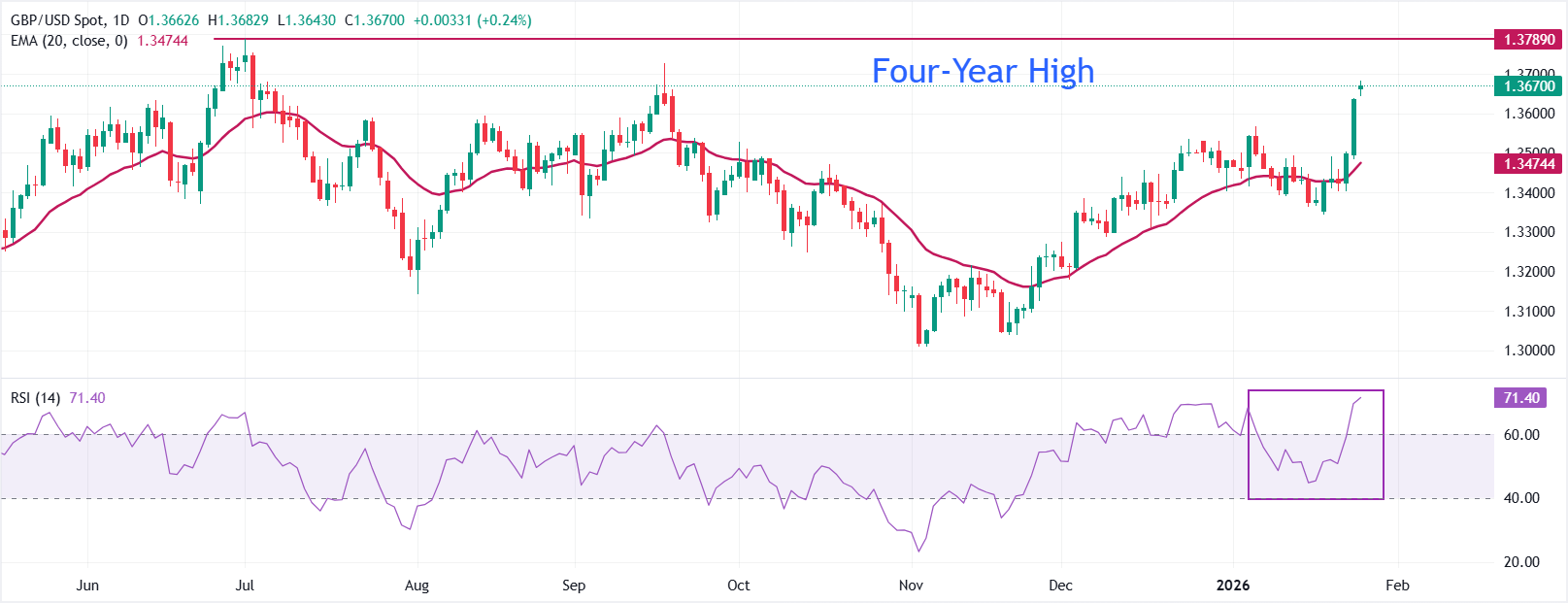 GBP/USD торгуется с повышением на уровне около 1,3670 на момент написания. Динамика цен уверенно держится выше восходящей 20-дневной экспоненциальной скользящей средней (EMA), которая поднялась до 1,3474 и поддерживает бычью структуру. Средняя значение увеличилось в последние сессии, усиливая позитивный тренд. Индекс относительной силы (RSI) на уровне 71,11 (перекуплен) сигнализирует о растянутом моментуме и предупреждает о возможности консолидации.