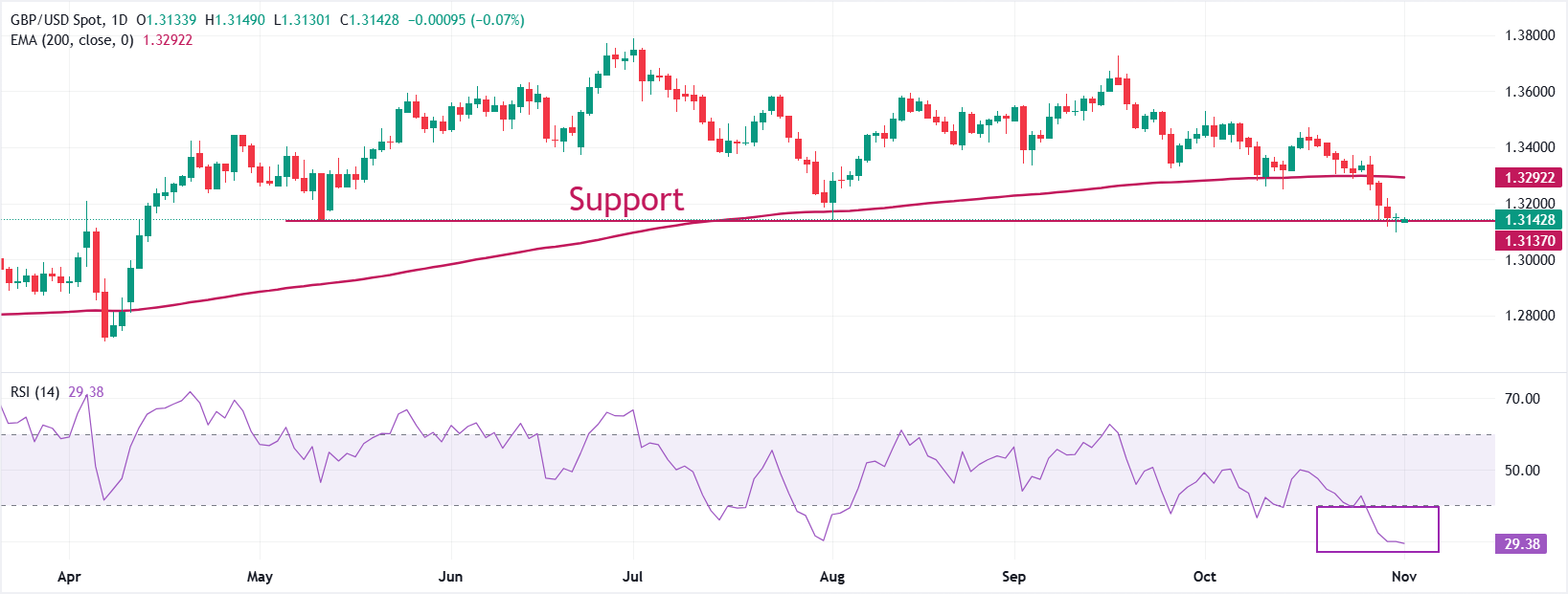 Фунт стерлингов находит временную поддержку против доллара США рядом с шестимесячным минимумом около 1,3100, зафиксированным в пятницу. Перспективы пары Cable остаются медвежьими, так как она торгуется ниже 200-дневной экспоненциальной скользящей средней (EMA), которая находится около 1,3290.