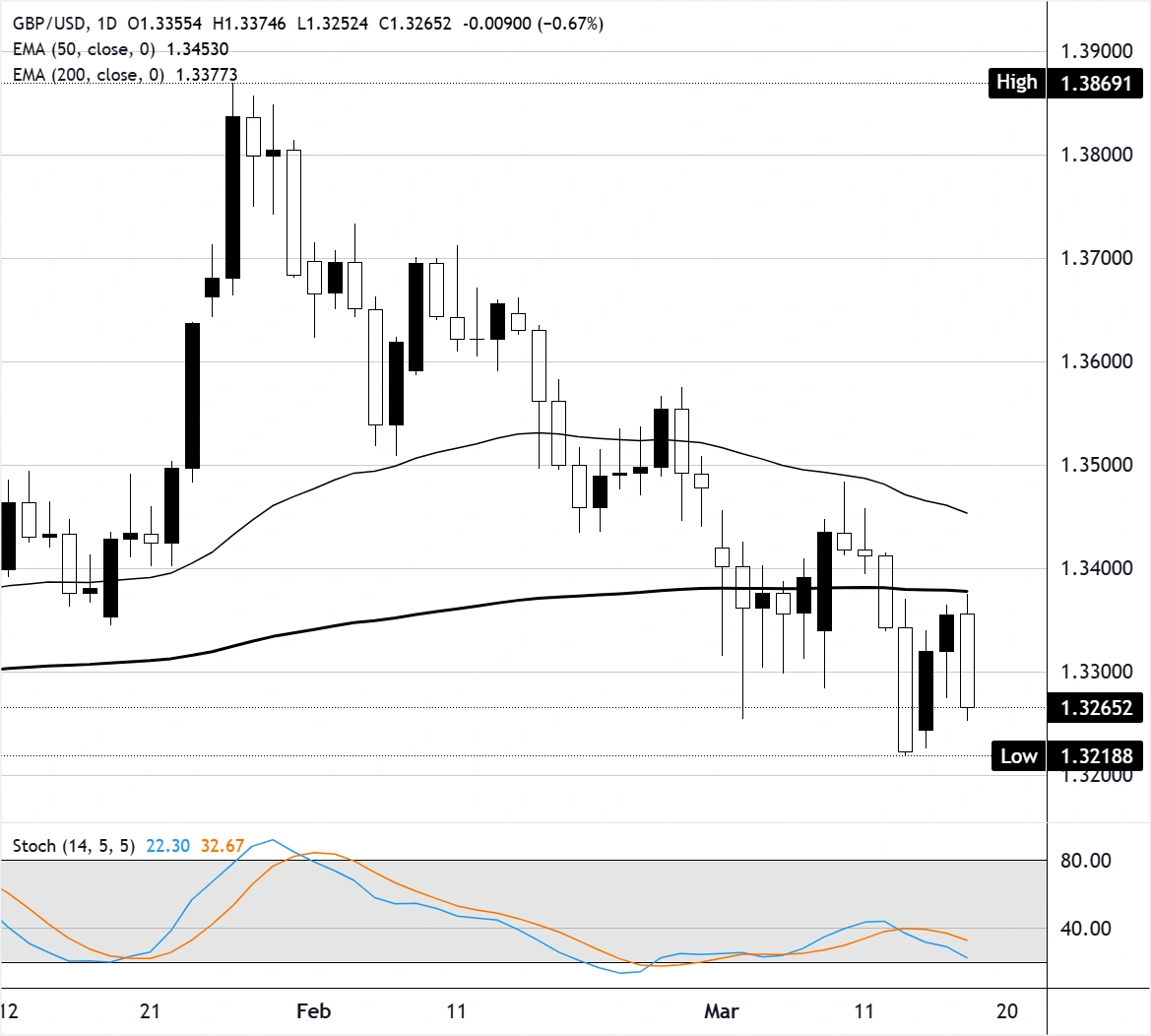 Пара GBP/USD упала примерно на 0,7% в среду, опускаясь ниже отметки 1,3300, поскольку курс фунта продолжает бороться с техническим уровнем. Распродажа продолжает откат от максимума конца января около 1,3870, при этом пара теперь торгуется ниже обеих ключевых дневных скользящих средних. Решительная медвежья свеча среды указывает на то, что нерешительное ценовое движение последних двух недель разрешилось в пользу снижения. Подробнее...