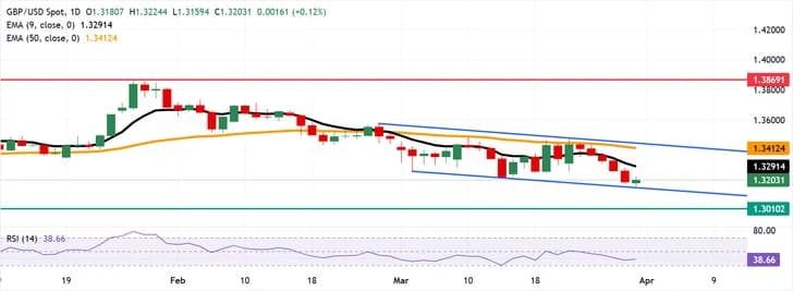 Пара GBP/USD прерывает пятиматчевую полосу потерь, торгуясь в районе 1,3200 на азиатских торгах во вторник. Технический анализ дневного графика указывает на продолжающийся медвежий уклон, так как пара движется вниз в рамках нисходящего канала. Краткосрочный уклон остается слабо медвежьим, поскольку GBP/USD удерживается ниже как девятидневной, так и 50-дневной экспоненциальных скользящих средних (EMA), которые ограничивают ценовое движение и формируют нисходящий краткосрочный профиль.