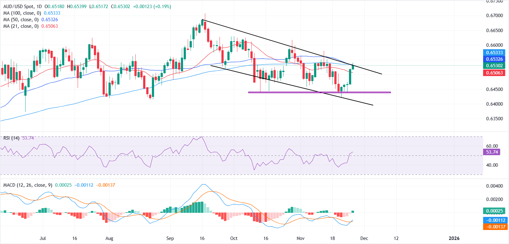 На дневном графике AUD/USD продолжает торговаться в рамках четко определенной модели нисходящего канала, при этом последний подъем уверенно давит на верхнюю границу модели. Эта зона теперь стала значительным техническим барьером, усиленным слиянием 50-дневной и 100-дневной простых скользящих средних (SMA), которые неоднократно ограничивали попытки роста в течение ноября.