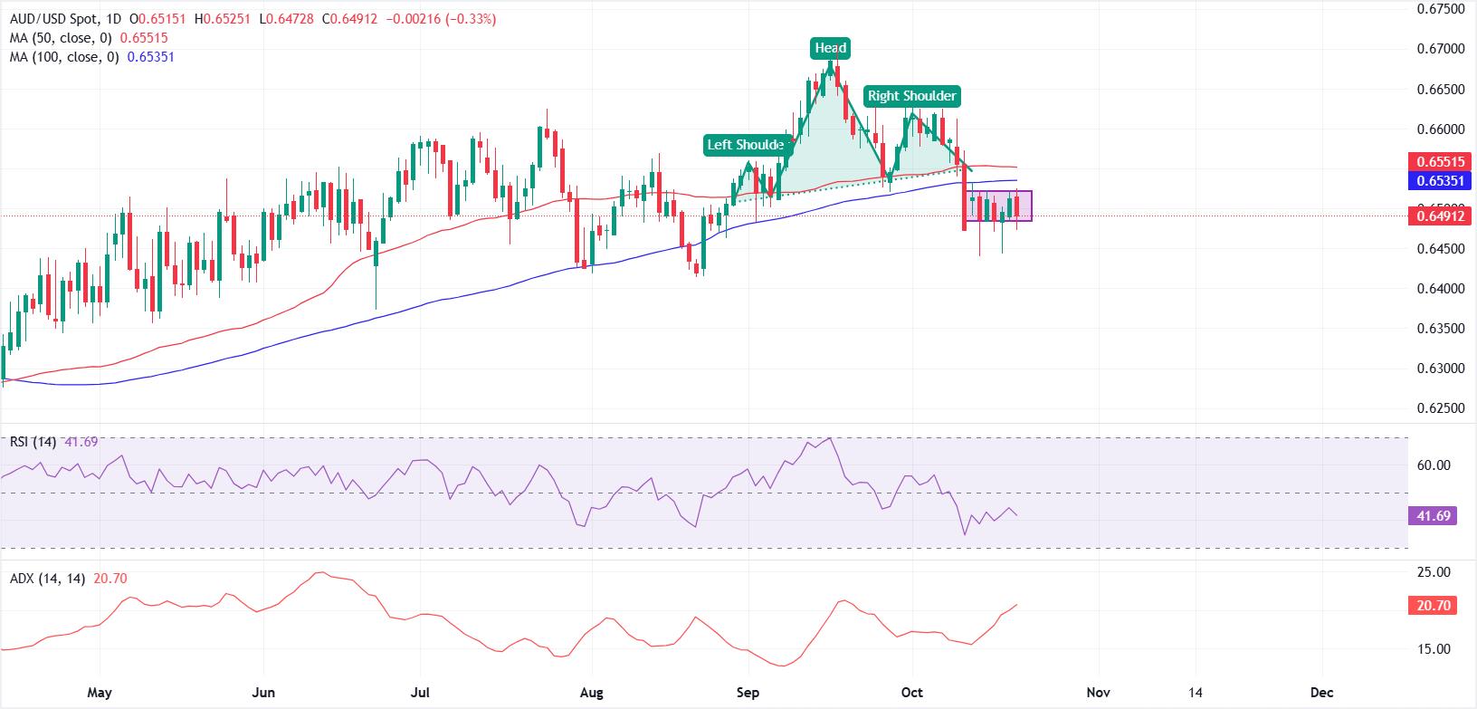 - AUD/USD консолидируется в диапазоне между 0,6480 и 0,6520 после пробоя модели Голова и плечи.