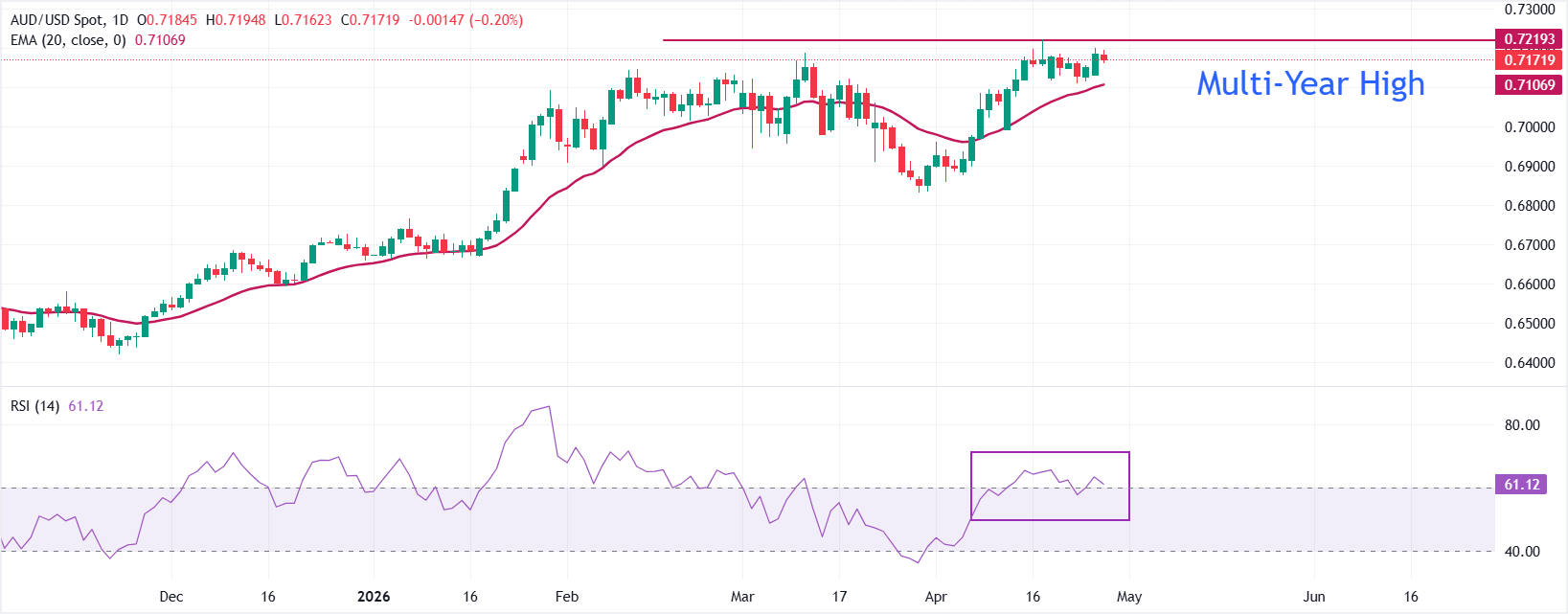 Пара AUD/USD торгуется с небольшим понижением около 0,7175 на момент публикации. Пара сохраняет бычий краткосрочный настрой, так как спот остается выше 20-дневной экспоненциальной скользящей средней (EMA) на уровне 0,7107, что указывает на сохраняющийся спрос при неглубоких откатах.
