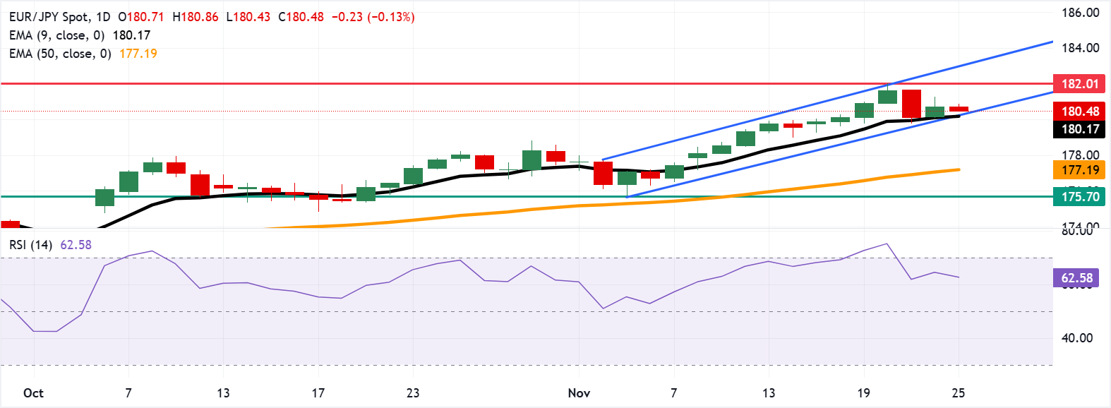 EUR/JPY обесценивается после того, как зарегистрировал более 0,25% в предыдущей сессии, торгуясь в районе 180,50 в ранние часы европейской сессии во вторник. Кросс движется вверх в рамках восходящего канала, что указывает на устойчивый бычий уклон.