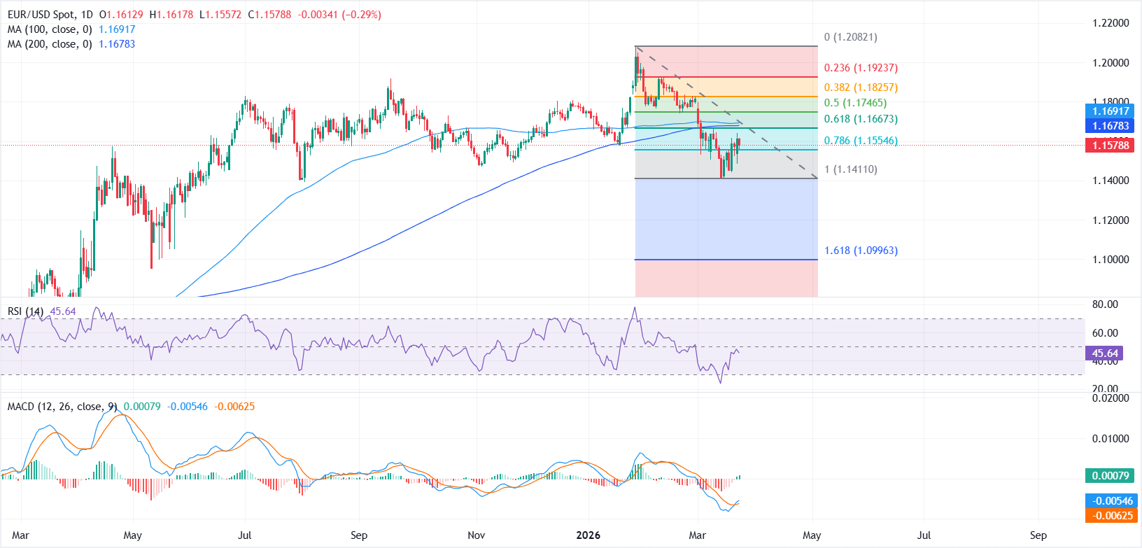 Евро (EUR) торгуется под давлением по отношению к доллару США (USD) во вторник, поскольку обострение геополитических рисков, связанных с войной США и Израиля с Ираном, продолжает поддерживать спрос на доллар США. На момент написания статьи EUR/USD торгуется около 1,1573, отыгрывая большую часть роста предыдущего дня и снижаясь почти на 0,35% внутри дня.