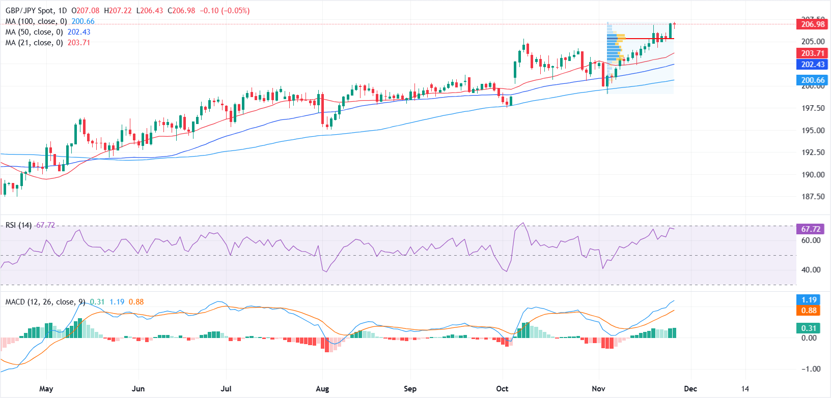 GBP/JPY держится около 207,00 в четверг после достижения накануне нового максимума этого года, при этом настроения склоняются в пользу фунта стерлингов (GBP) после осеннего бюджета Великобритании.