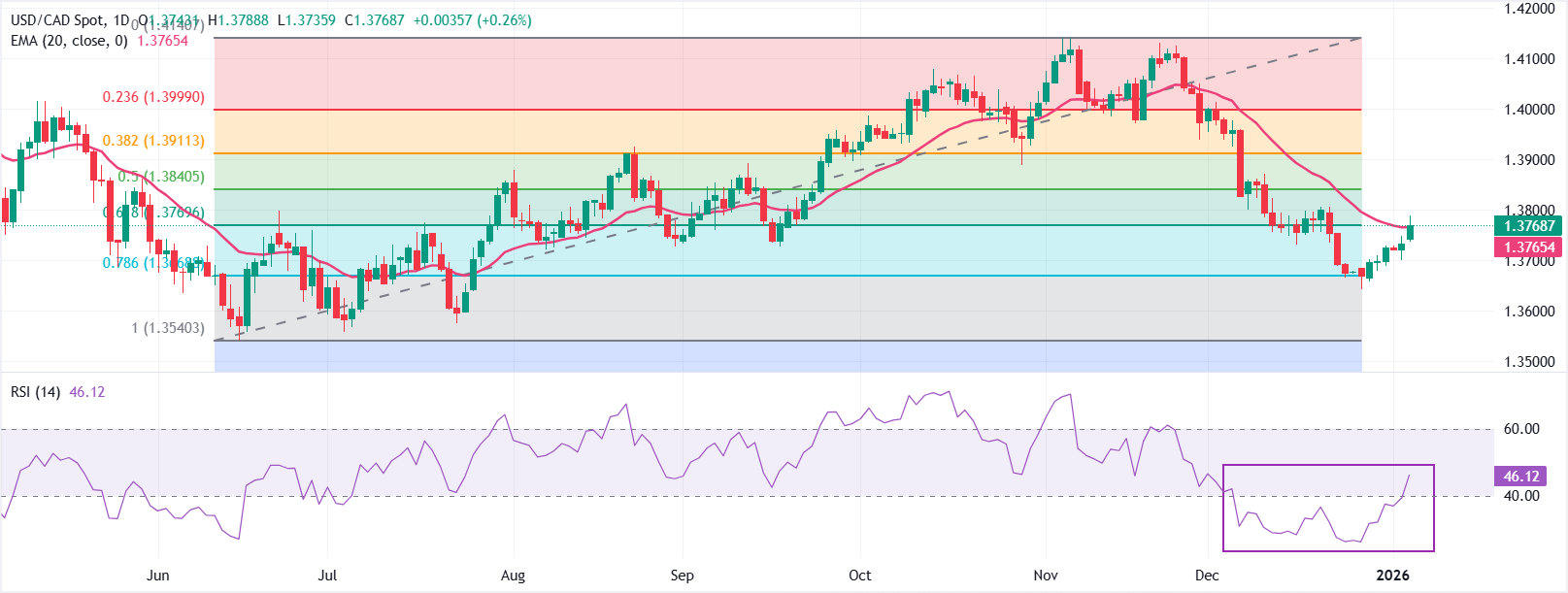На дневном графике пара USD/CAD торгуется на уровне 1,3768. 20-дневная EMA выровнялась на уровне 1,3765 после устойчивого снижения, а цена немного восстановилась выше этого уровня. Закрытие выше МА укажет на краткосрочное основание, в то время как возврат ниже нее сохранит медвежий настрой. RSI на уровне 46 восстанавливается после перепроданности, но остается ниже средней линии 50. Измеренный от минимума 1,3540 до максимума 1,4141, уровень 61,8% коррекции на 1,3770 предлагает начальную поддержку.