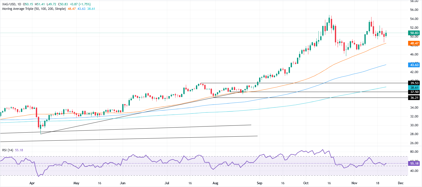 Серебро (XAG/USD) резко растет в североамериканскую сессию, увеличившись более чем на 2,50% после отскока от дневных минимумов на уровне $49,73 и торгуется на уровне $51,37 на момент написания. Ожидания, что Федеральная резервная система может смягчить политику в декабре, снижают доходность казначейских облигаций США, что является попутным ветром для недоходного металла.