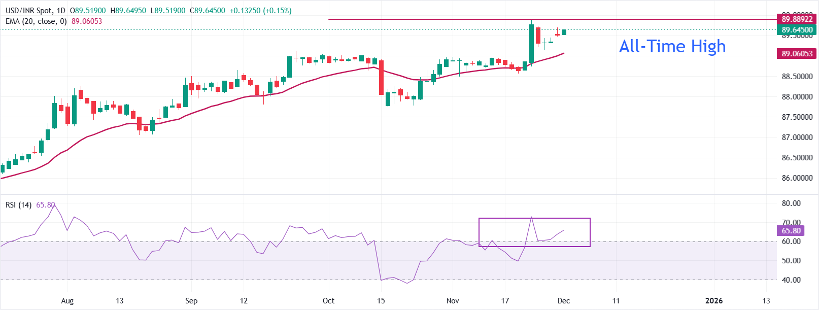Индийская рупия (INR) немного снижается по отношению к доллару США (USD) после стабильного открытия в начале недели. Пара USD/INR поднимается до уровня около 89,65, так как индийская рупия испытывает трудности с привлечением заявок, а постоянные иностранные оттоки компенсируют влияние сильного роста ВВП Индии в третьем квартале.
