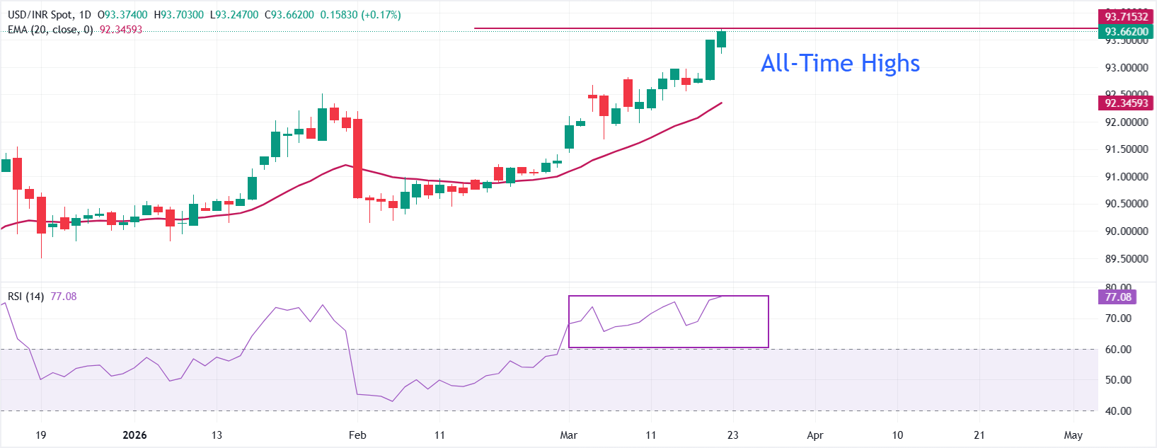 Пара USD/INR поднимается к отметке около 93,73 в пятницу. Краткосрочный уклон является бычьим, поскольку цена продолжает торговаться выше растущей 20-дневной экспоненциальной скользящей средней (EMA), подтверждая краткосрочный восходящий тренд с уровня около 90. Последний рост увеличил расстояние от 20-дневной EMA, что свидетельствует о сильном покупательском давлении, а не о постепенном медленном росте.
