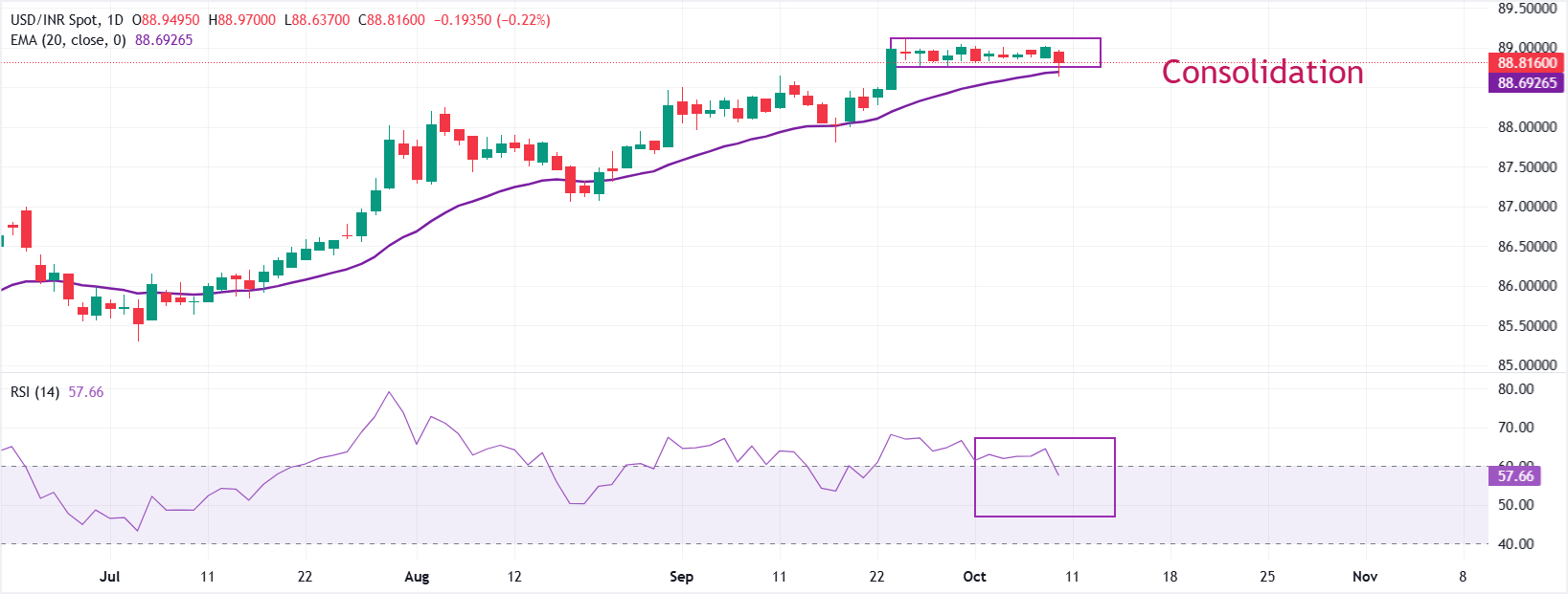 USD/INR пробивает двухнедельный узкий диапазон между 88,76 и 89,11 вниз. Пара приближается к возвращению к 20-дневной экспоненциальной скользящей средней (EMA), которая наклонена вверх около 88,70.