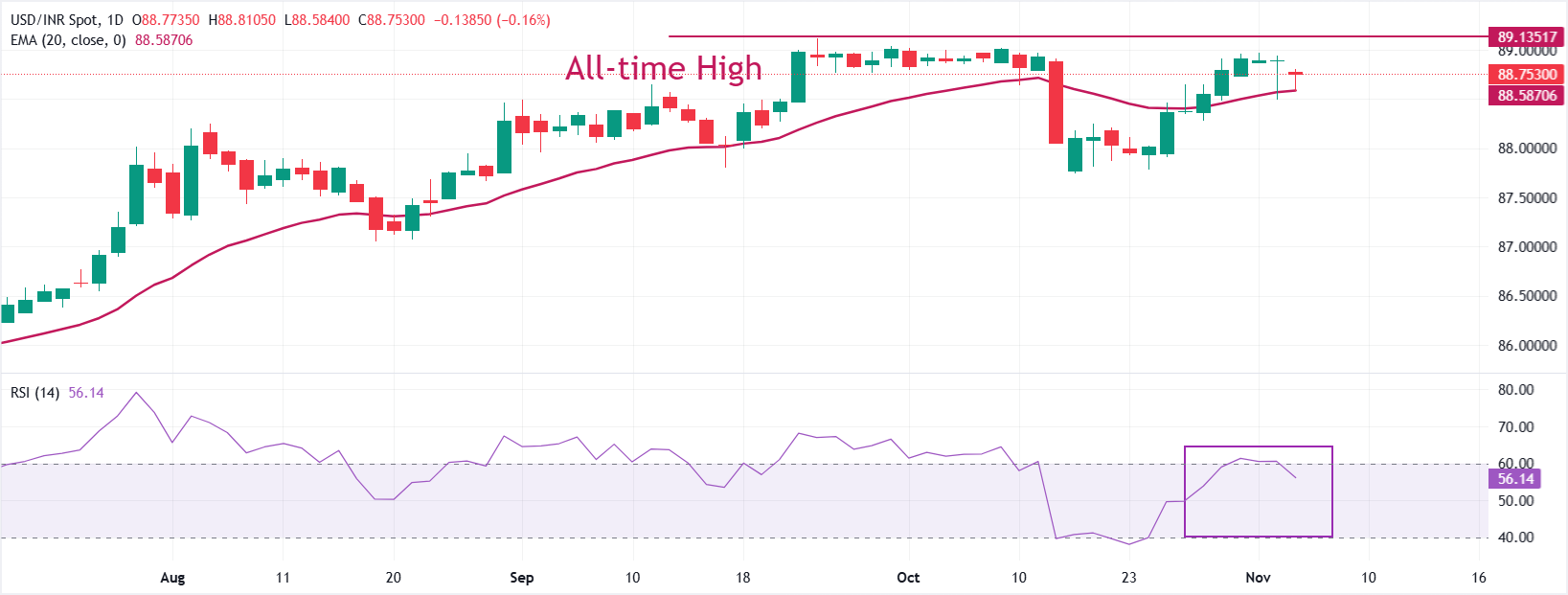 USD/INR падает до уровня около 88,60 в среду. Пара продолжает находить поддержку около 20-дневной экспоненциальной скользящей средней (EMA), которая торгуется около 88,58.