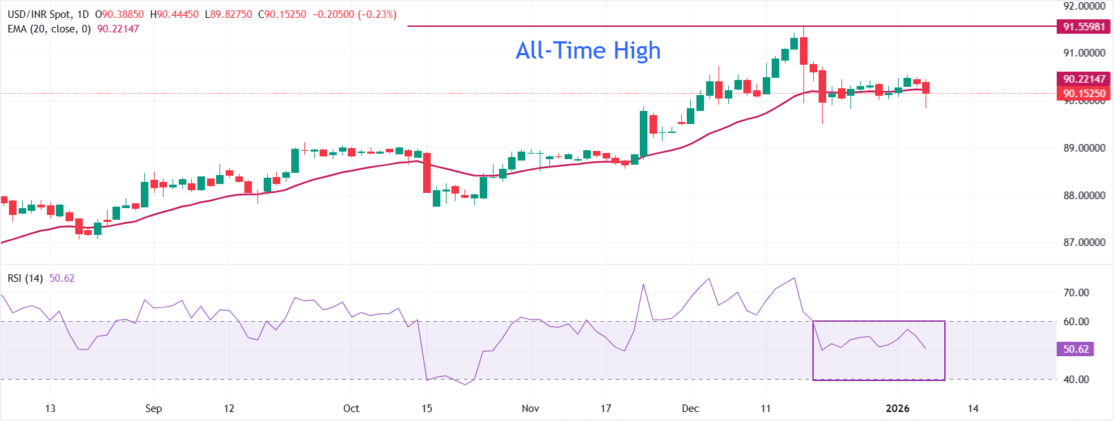 USD/INR тестирует уровни ниже психологического уровня 90,00 на открытии в среду. Перспектива цены стала неопределенной, так как она испытывает трудности с удержанием 20-дневной экспоненциальной скользящей средней (EMA), которая торгуется около 90,22.