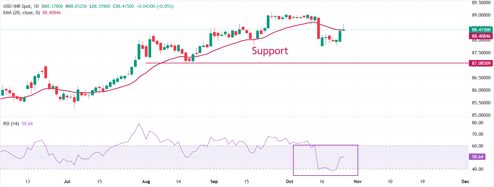Пара USD/INR подскакивает к уровню около 88,60 во вторник. Пара стремится вернуться выше 20-дневной экспоненциальной скользящей средней (EMA), которая торгуется около 88,41.