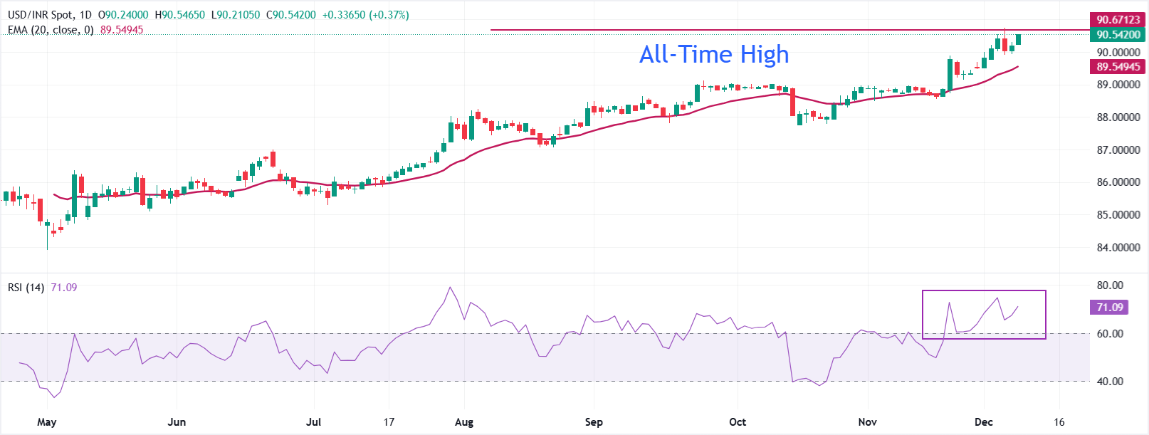Технический анализ: USD/INR видит дальнейший рост выше 90,70