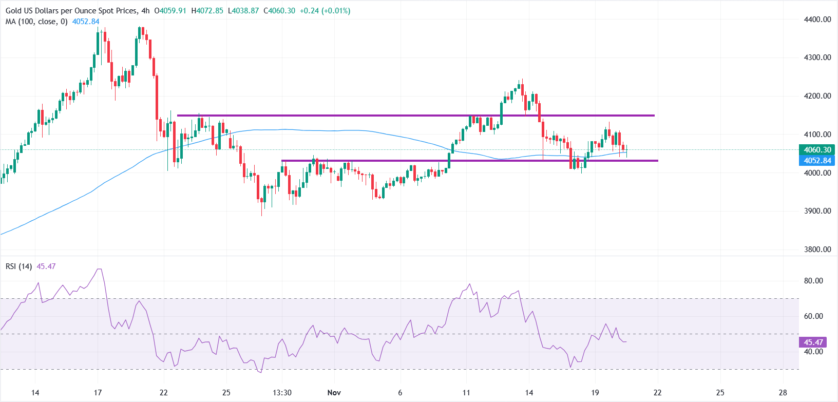 Золото испытывает незначительное понижательное давление в четверг, опускаясь ниже ключевой отметки $4 100 за тройскую унцию, поскольку доллар США остается под давлением и поддерживается сокращающимися ожиданиями снижения ставки Федеральной резервной системой в декабре.