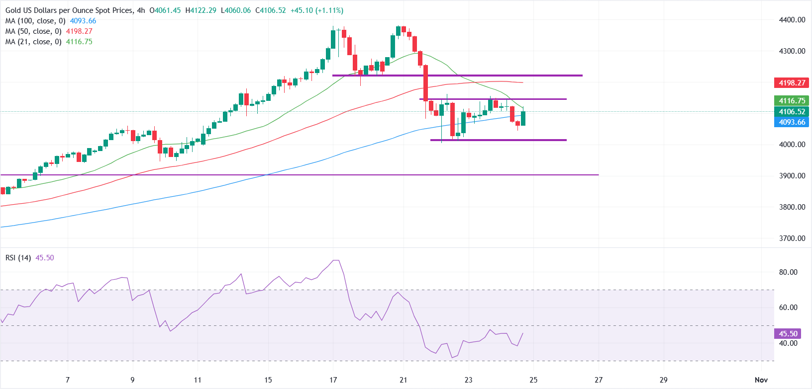 На момент написания статьи XAU/USD торгуется около $4 100, восстанавливаясь после сессионных минимумов вблизи $4 044, хотя металл по-прежнему на пути к прерыванию своей девятинедельной победной серии.