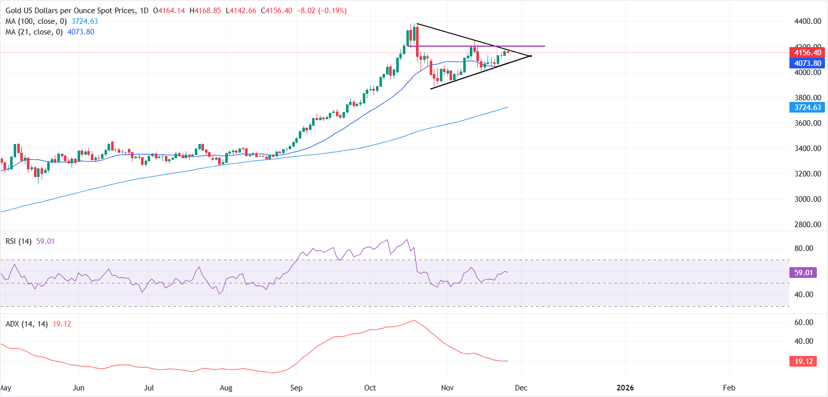 Технический анализ: XAU/USD тестирует сопротивление треугольника с фокусом на $4,200