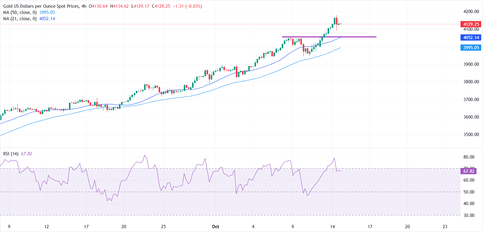 На момент написания статьи XAU/USD уверенно держится вблизи $4 125 после резкого внутридневного падения с рекордных максимумов до $4 090. Движение отражает умеренную фиксацию прибыли после чрезмерного ралли, так как трейдеры сокращают позиции для обеспечения недавних прибылей. Однако снижение остается под контролем, так как опасения по поводу затяжного торгового противостояния между двумя крупнейшими экономиками мира продолжают доминировать в настроениях на рынке.