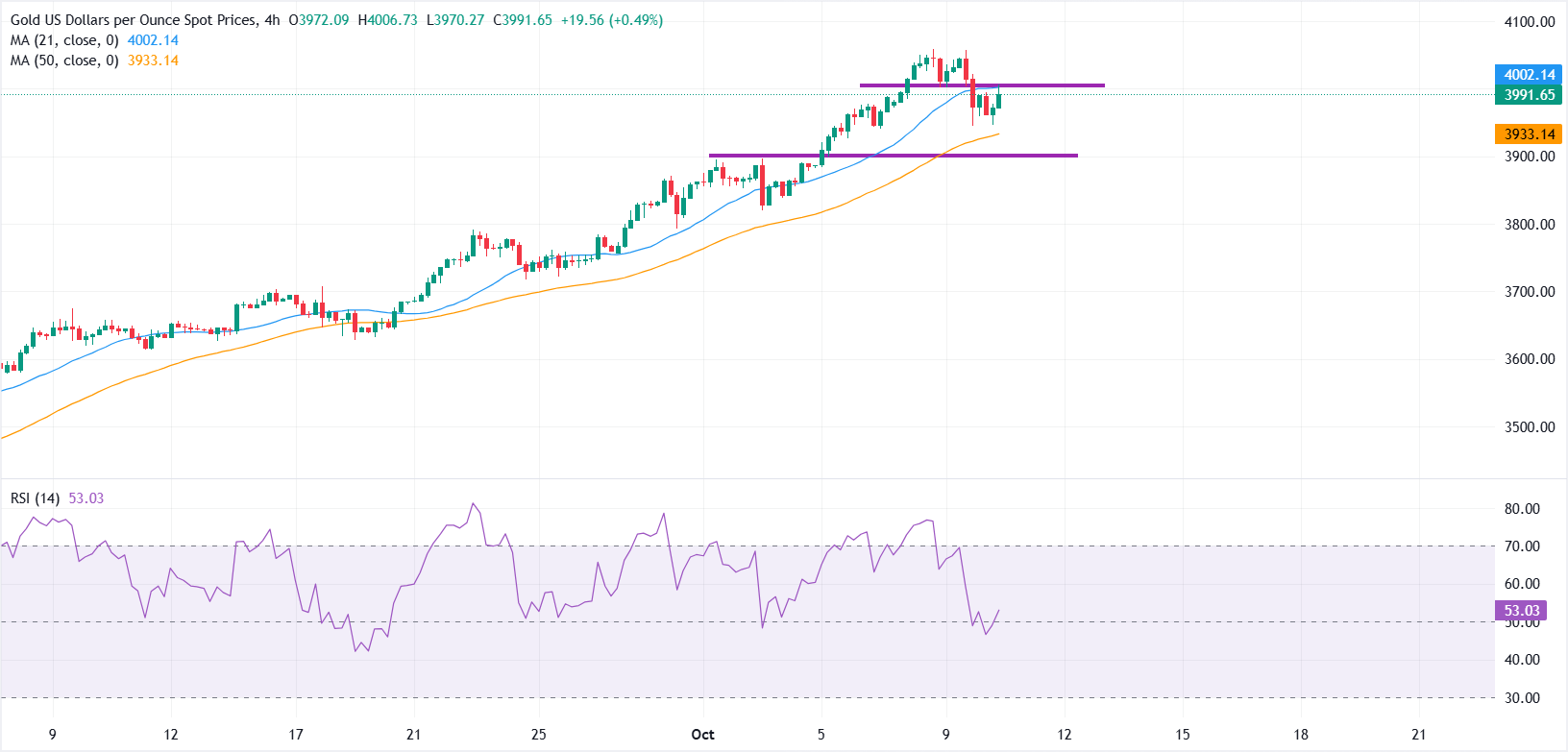Золото пытается восстановиться после тестирования зоны поддержки $3 950. Металл сейчас испытывает сопротивление в области $3 995-$4 000, что совпадает с 21-периодной простой скользящей средней (SMA).
